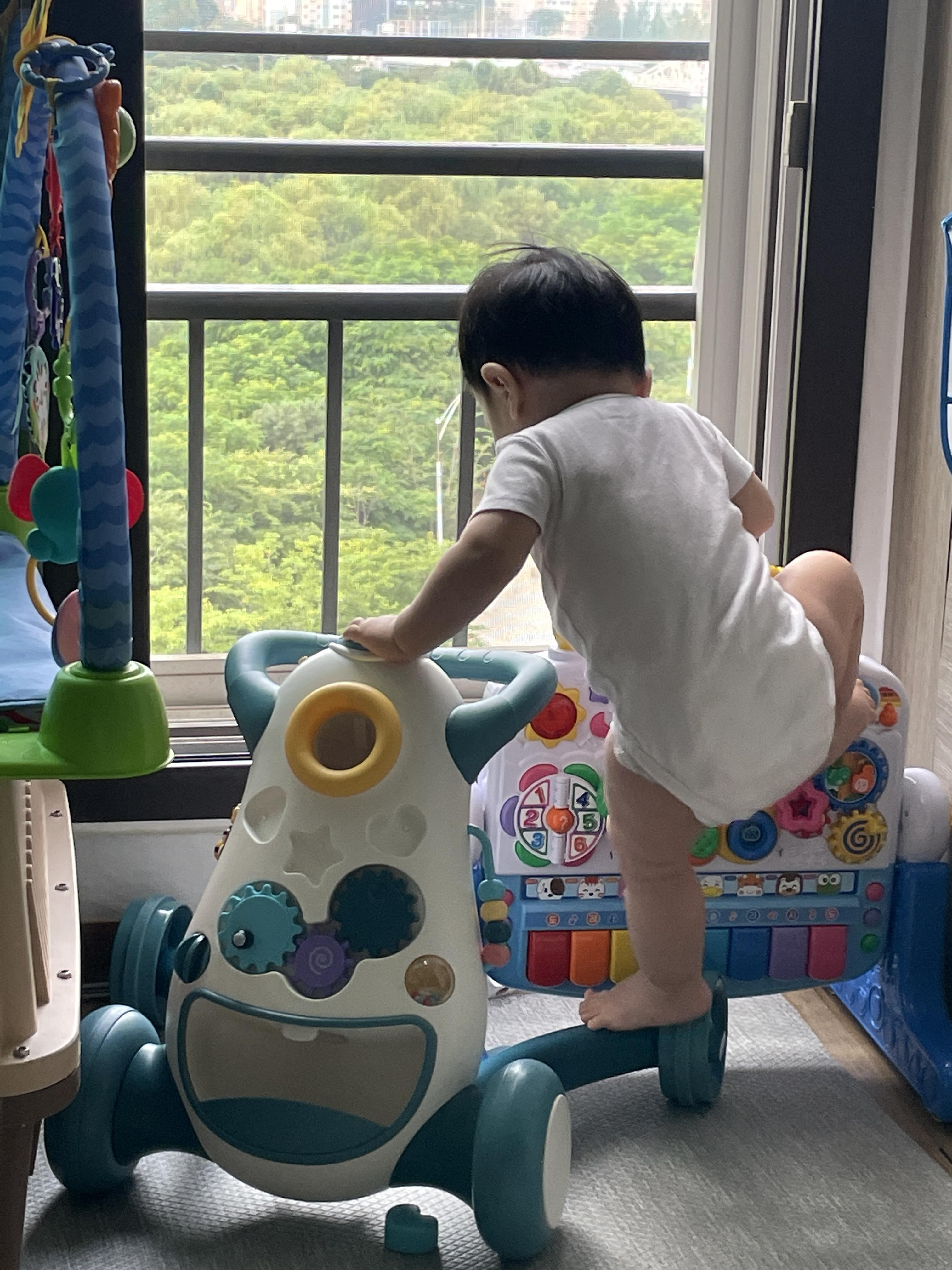 - 물건을 던지고 떨어뜨리는 것을 좋아한다. 손에 닥치는 물건은 다 던져버린다. 침대 안 장난감이며 베개며 모두 밖으로 던진 상태. 재밌는 건 물건을 던지거나 떨어뜨릴 때 미리 소리가 날 것을 예상해서 눈을 질끈 감는다는 것.