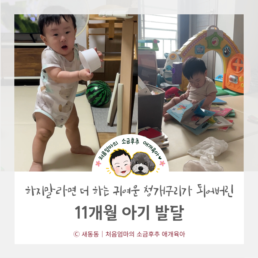 - 사실 이건 11개월 발달이라기엔 약간 부끄러운 부분이지만, 소금이 첫니가 드디어 올라오기 시작한다. 보통 11개월 아이들은 6~8개까지 이가 나 있는 것 같은데, 이가 계속 안나다가 11개월이 끝나갈 무렵부터 하얗게 올라오기 시작했다. 12개월까지 안나면 병원에 가야 한다고 알고 있었는데, 다행이다.