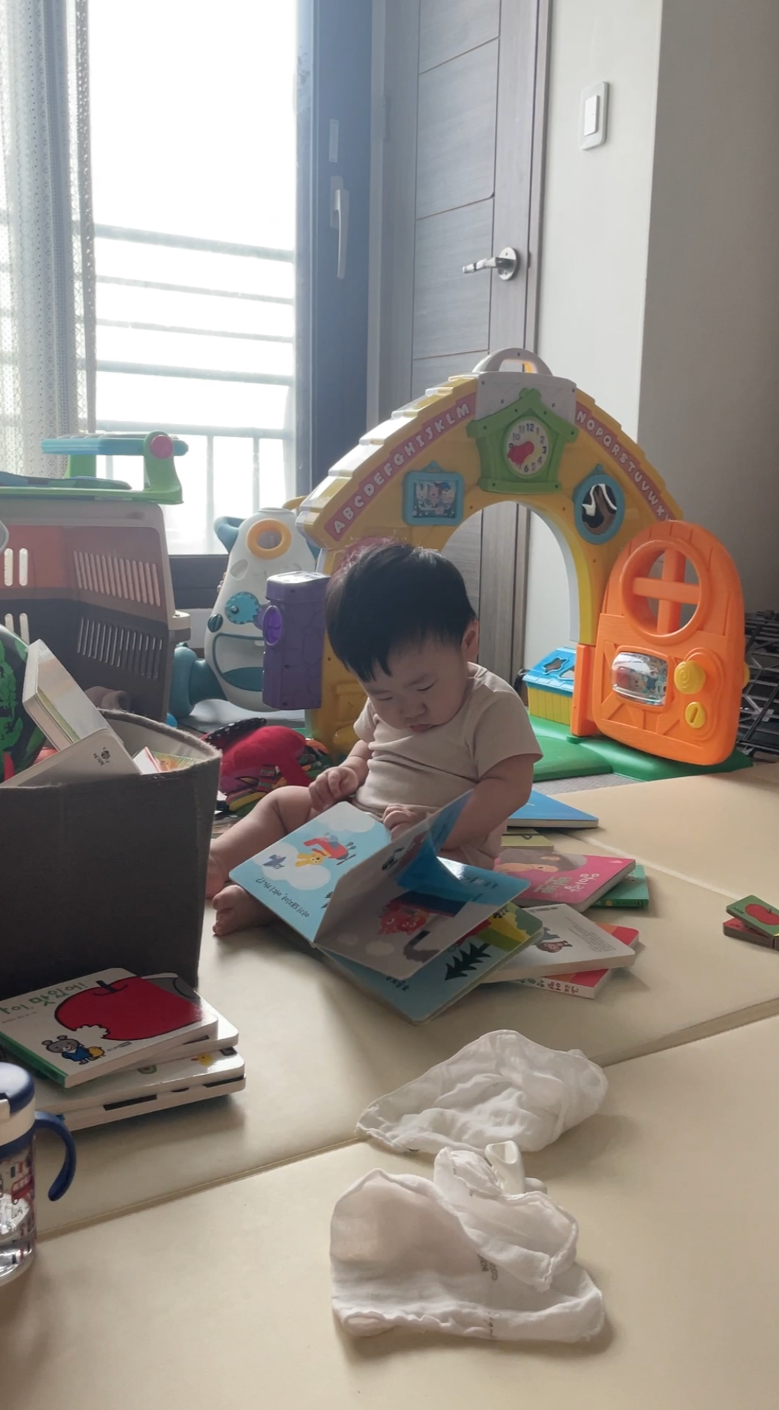 - 책을 던지거나 쌓거나하는 장난감으로 사용하다가, 드디어 읽는데 재미를 붙인 것 같다. 가만히 앉아서 책을 한 장씩 넘겨보는 일이 많아졌다.